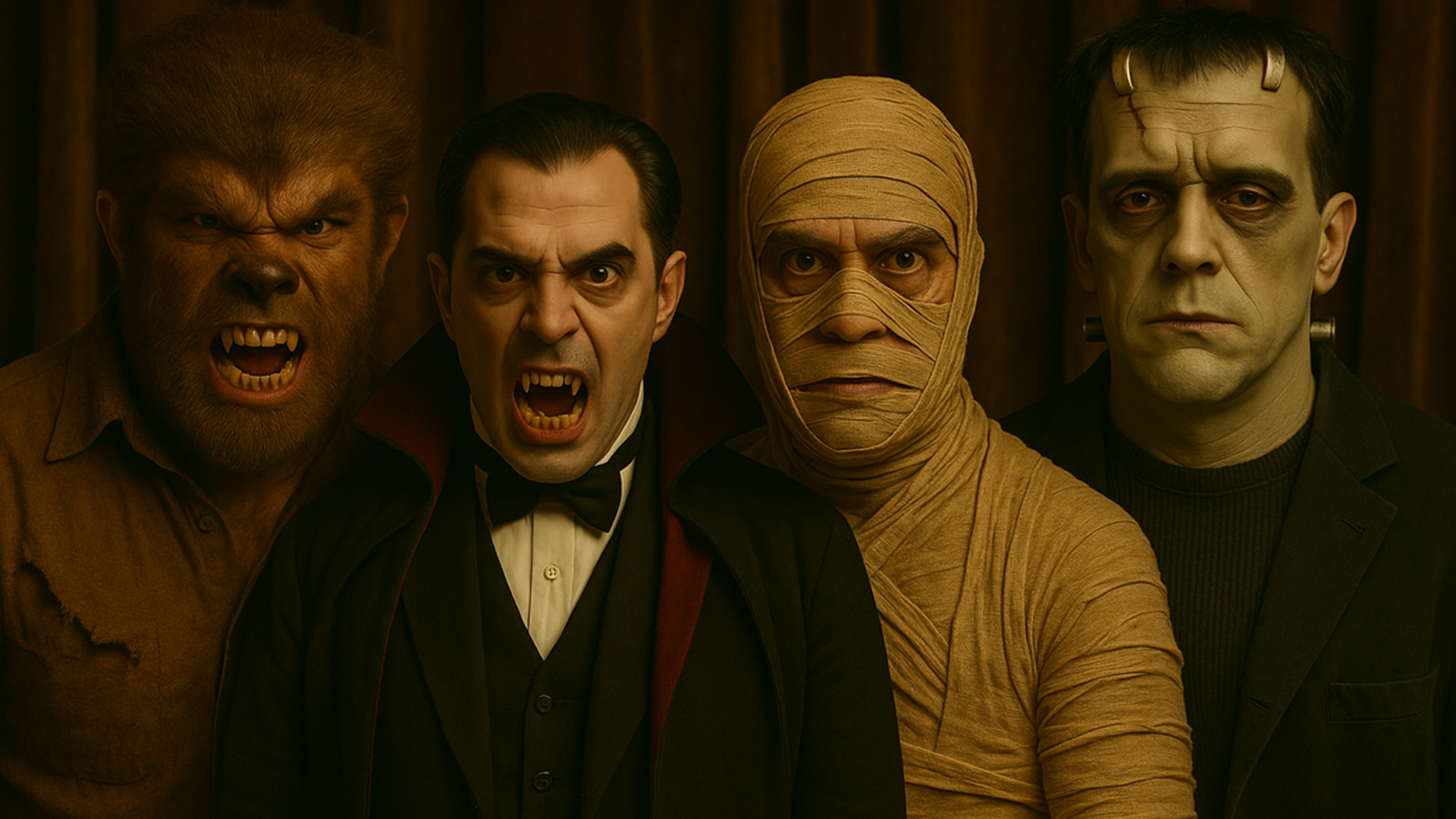 “Make a hyper photorealistic group portrait featuring four classic movie monsters, each transformed from this man’s face in the attached reference photo through expert prosthetic-style makeup and cinematic lighting. The monsters are a savage Wolfman with sharp teeth, and glowing eyes, a Vampire in a black cloak with pale skin, red lips, and clearly visible fangs bared;, Frankenstein’s Monster with green-gray skin, neck bolts, and detailed facial scars, and a Mummy wrapped in aged, tattered bandages that still reveal parts of the man’s face beneath. They are posed together in a well-lit Gothic library. The lighting is warm and evokes vintage Hollywood studio portraiture. Each monster should remain distinct but visibly share the same face, as though all were played by the same actor.