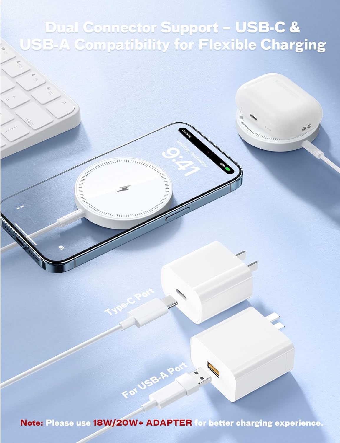 【Dual Ports + Long Cable|Flexible Usage】Tired of adapter hassles or short cables? Our magnetic wireless charger features a 3.96 ft cable and both Type-C & USB-A compatibility (with a handy Type-C to A connector). Plug into any power source and start charging, stretch out on the couch, work at your desk, or relax in bed, charge freely.