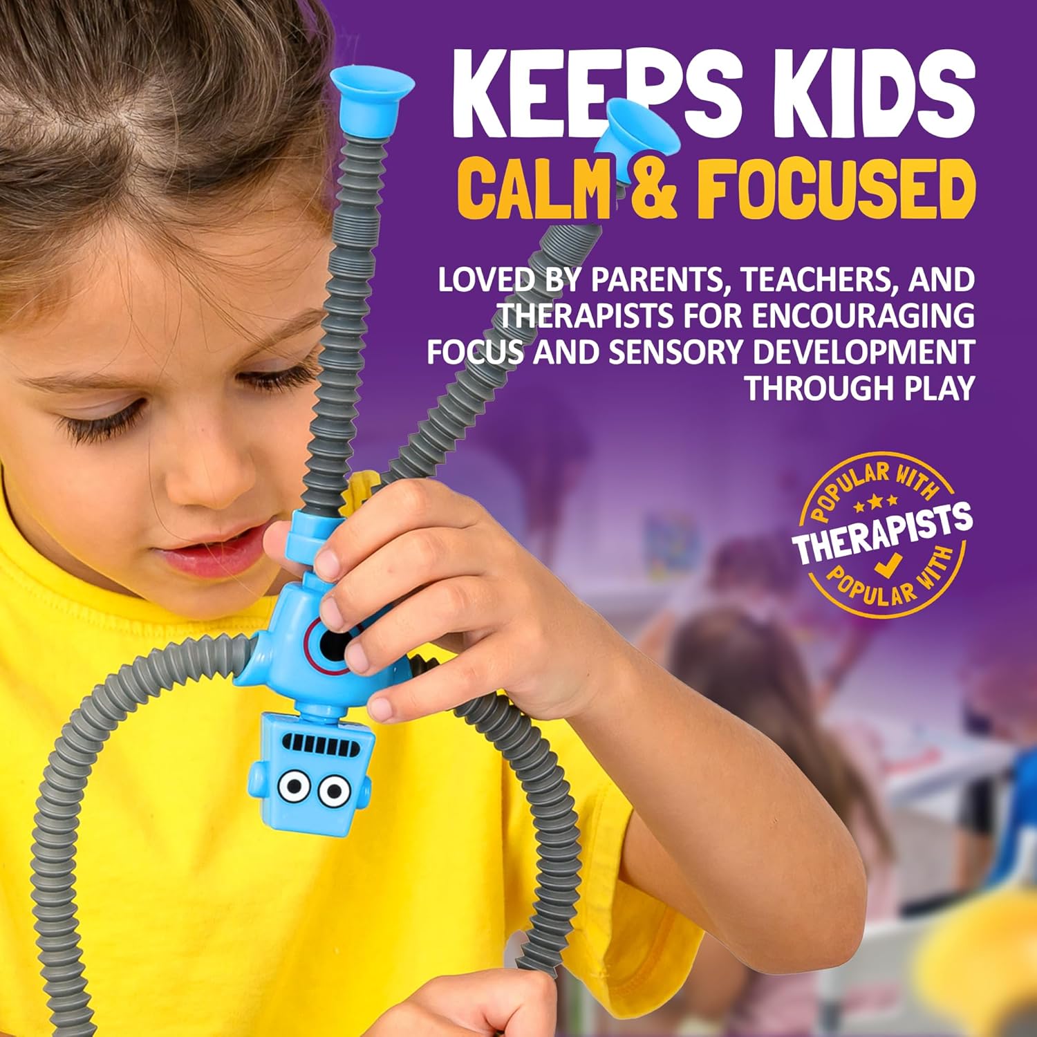 🤖 FUN SENSORY TOYS FOR KIDS – brightly colored Robot Toys will keep the kids busy & engaged while nurturing their senses & developing motor skills thanks to its pop tube arms & legs featured with UNEVEN TEXTURE & SATISFYING POPPING SOUND; The robot toy additionally features SUCTION CUP limbs easily attaching itself to any flat service like a window or a desk; Sensory toys are a toddler essential & toddler must have by introducing tactile sensation and accelerating early development;