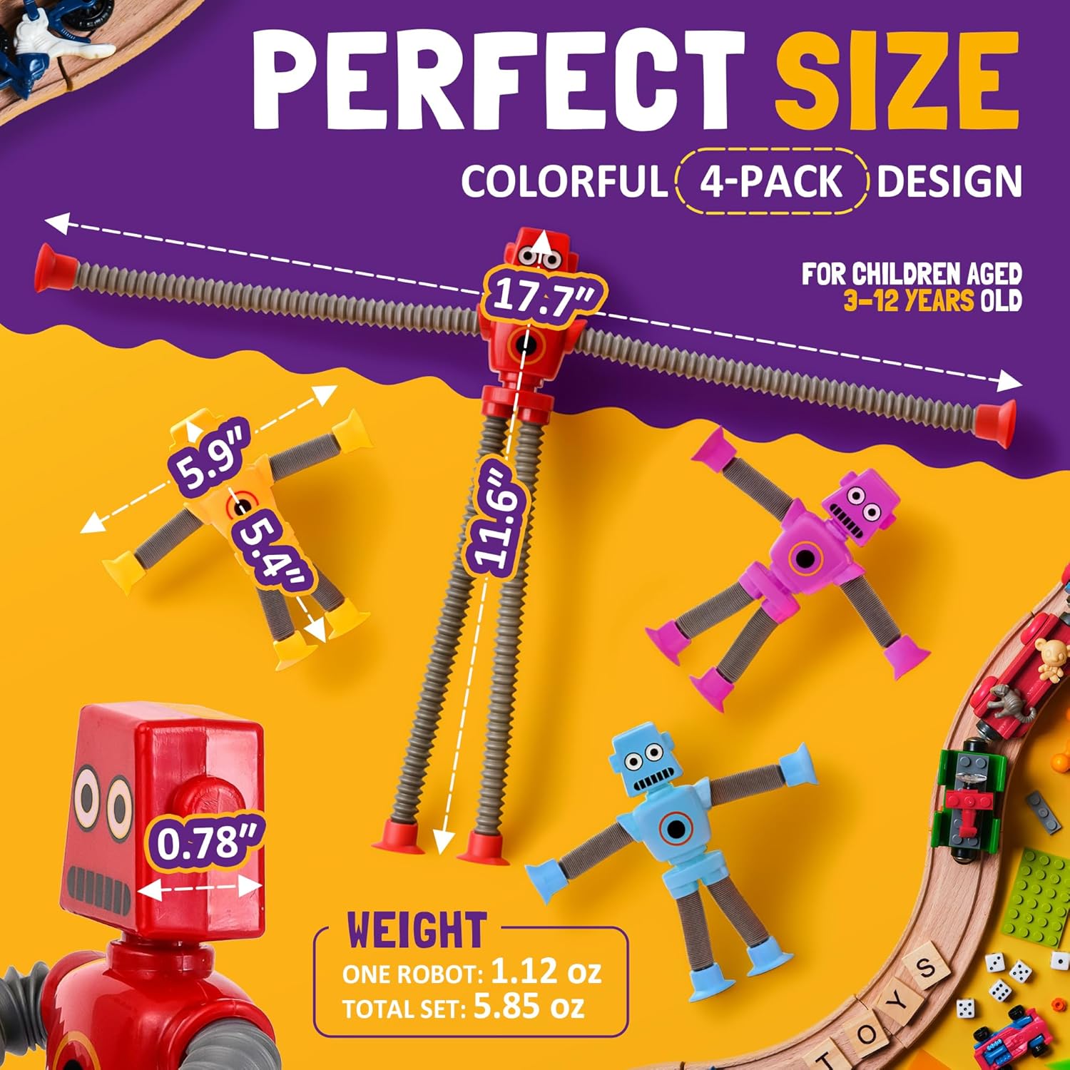 Robots have telescopic arms & legs for fidgeting, uneven textures & satisfying sound when the pop tube limbs stretch and suction cup hands & feet giving you a pleasant feeling sticking them on & off surfaces. Sensory toys help early development.