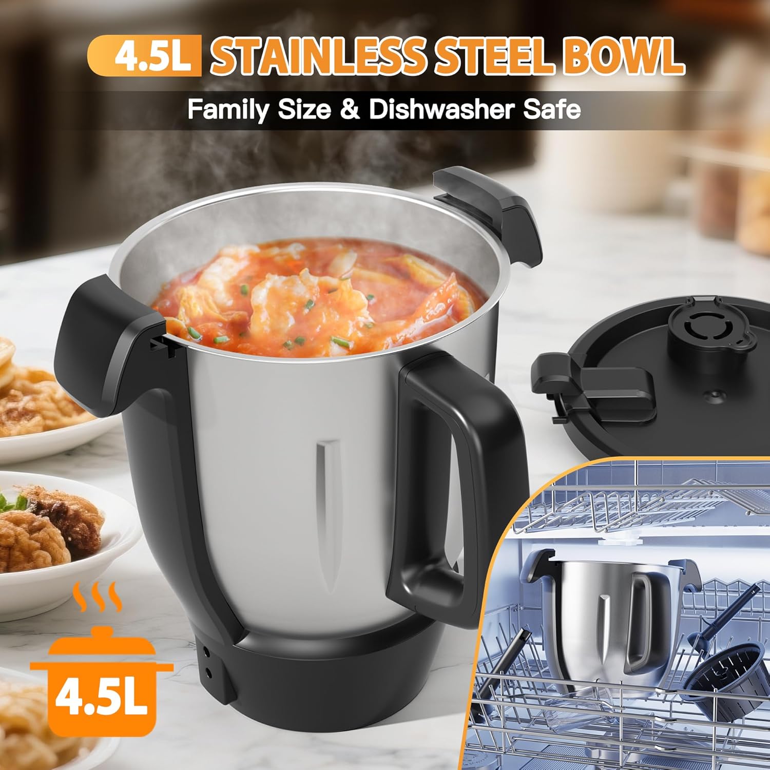 【Powerful 1000W Heating & Mixing System】 Equipped with a dual 1000W heating and motor design, the Fenbeli cooking machine handles a wide range of ingredients with ease. Its 3.0L stainless steel bowl (4.5L max) supports large family meals, while 12 adjustable speed levels and a temperature range from 37°C to 130°C give you precise control over every recipe.