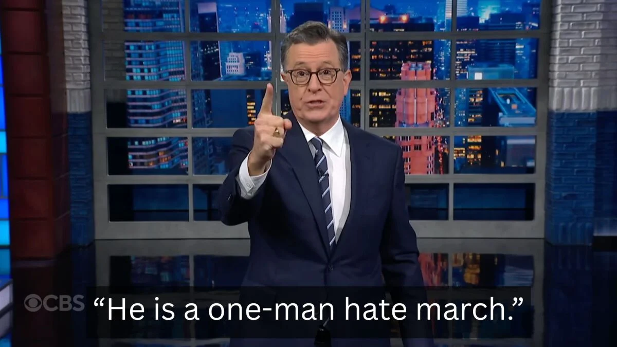“There it is: King Trump crapping on America. Which is insane, though I will grant, factually accurate,” says Colbert. “This video was vile and violent and only proves the point of the ‘No Kings’ march even more. What decent democratic leader would ever post a video of themselves sh**ing on peaceful protesters? He is a one-man hate march.”