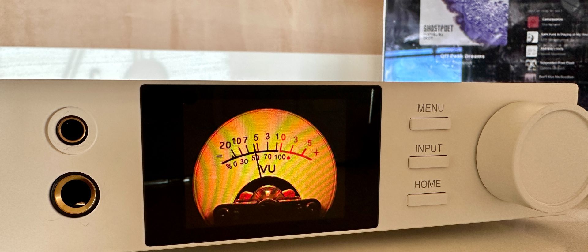 Options for the screen consist of a ‘spectrum analyser’ (which is sure to remind readers of a certain age of a graphic equaliser from back in the day), a readout of volume level, file format and file resolution, or a virtual VU meter (which is one for readers of an even more certain age). There’s a choice of colour and adjustable brightness, but in every circumstance the display is legible and crisply rendered, so navigating menus is always straightforward.